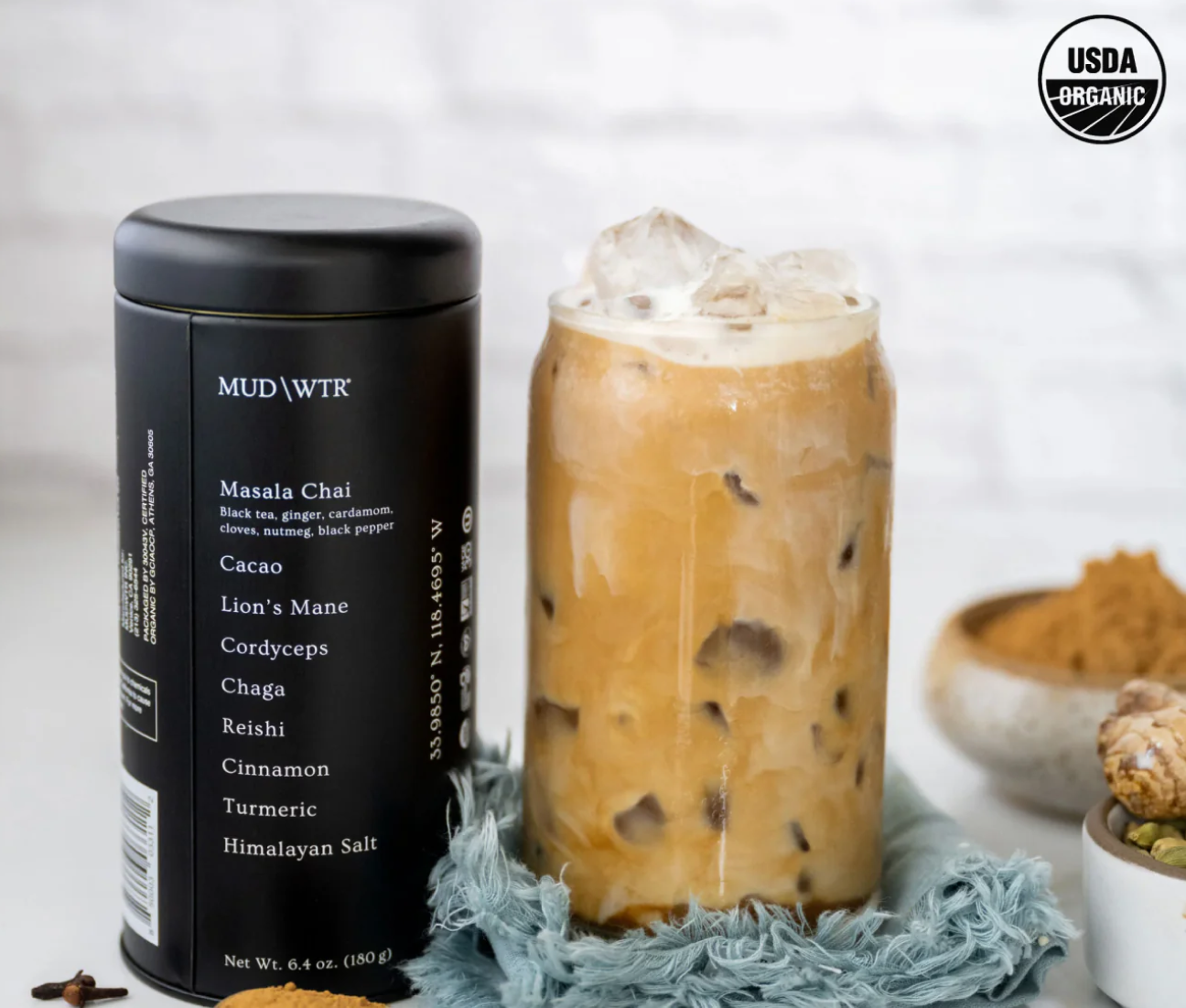 MUD\WTRās original blend isnāt coffee at all. Itās cacao, masala chai, turmeric, cinnamonāplus 2,240 mg of organic, USA-grown mushrooms in every serving.