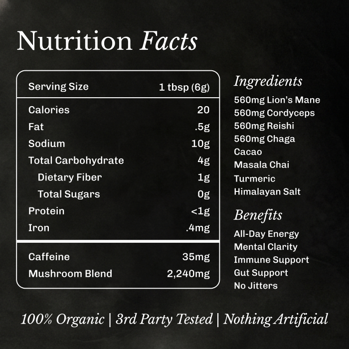 A coffee free blend of black tea, cacao, warming chai spices and functional mushrooms.