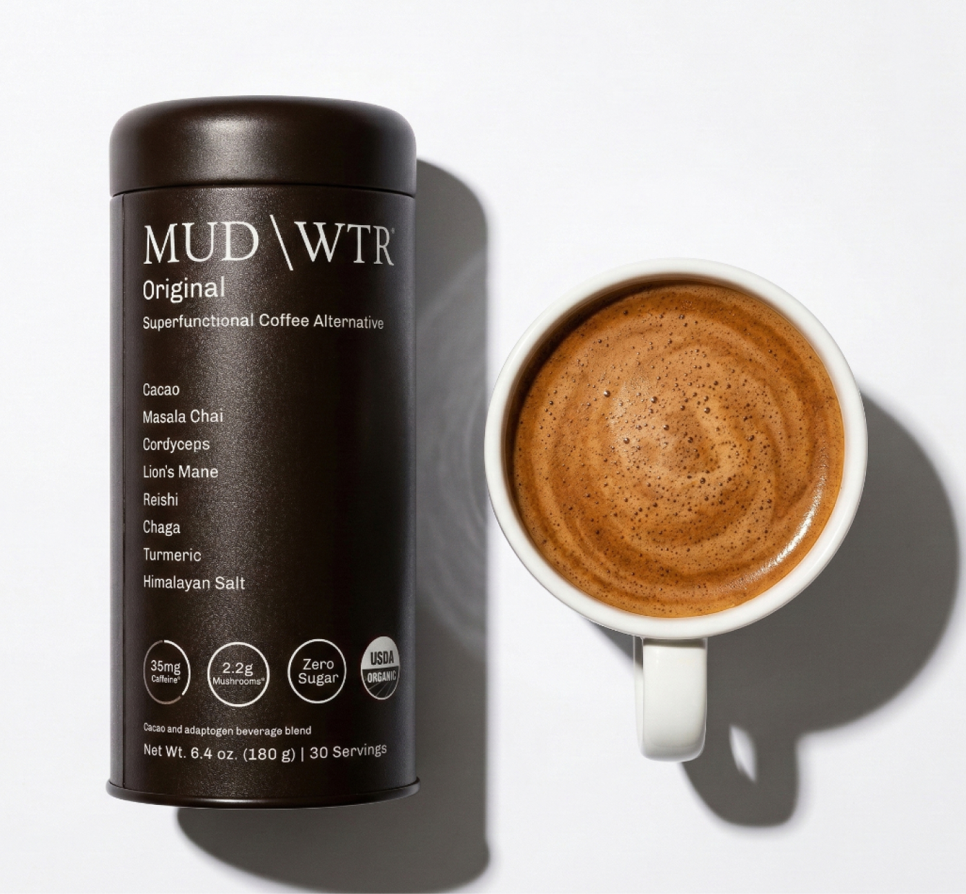 MUD\WTR isn't coffee at all. It's organic cacao, masala chai, turmeric, cinnamon, and black tea. Rich, warm, and actually good.