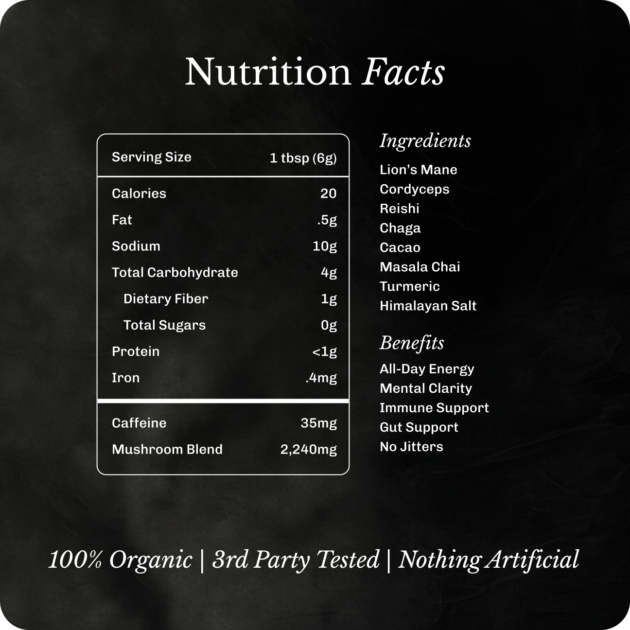 Organic, USA-grown lion’s mane, reishi, chaga, and cordyceps. Full spectrum, no fillers, third-party tested, and intentionally built into each blend for focus, immunity, and gut support.