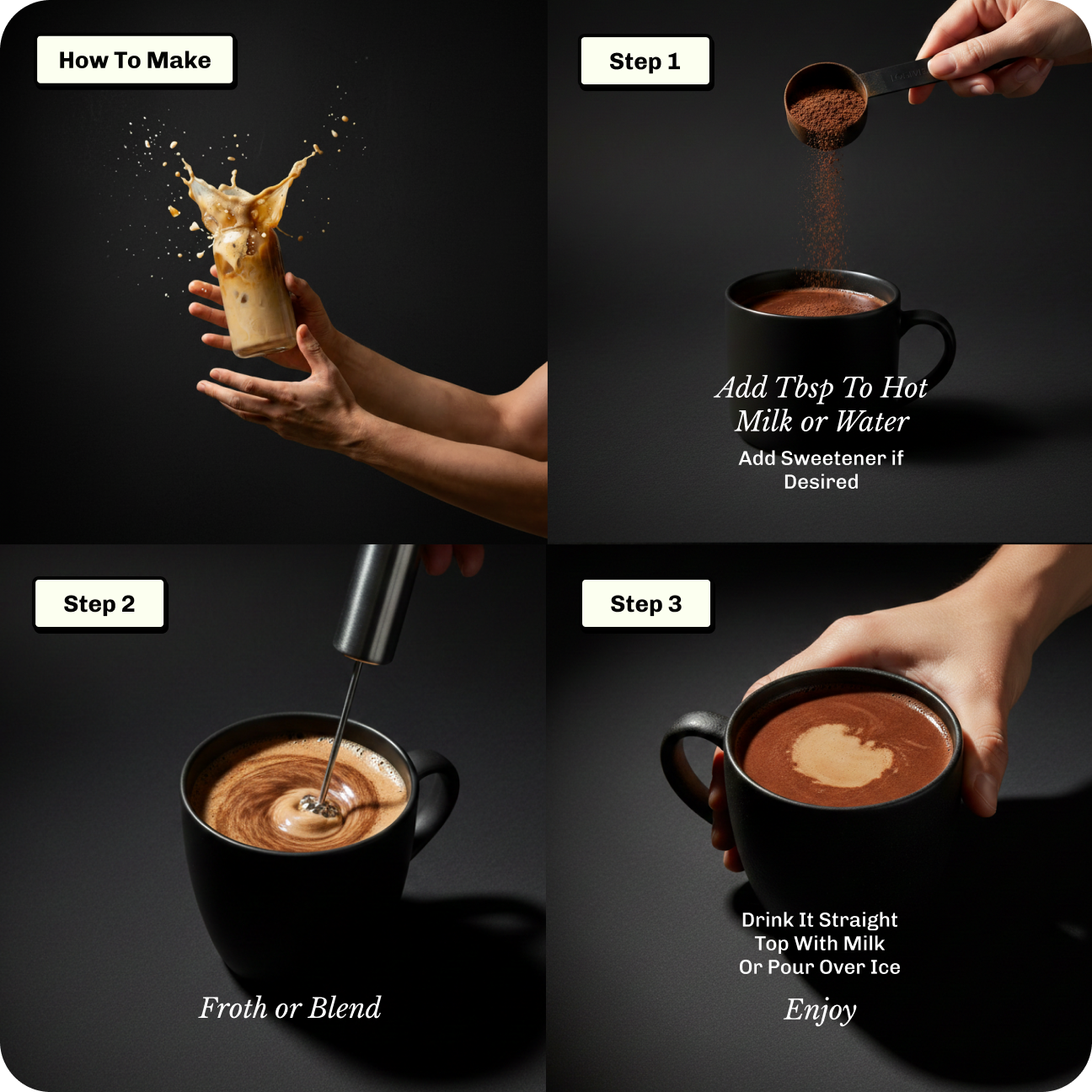 Scoop, add hot water, stir or froth, then add milk if you want something creamier. For iced, dissolve in a splash of hot water first, then pour over ice and top with milk.