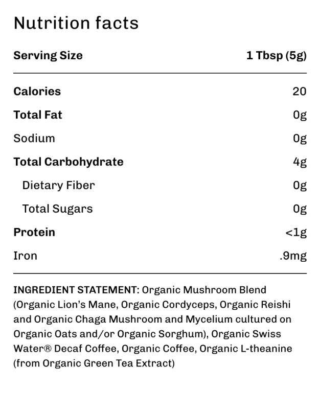 Made for coffee lovers with real Arabica coffee beans and swiss water decaf, L-theanine and functional mushrooms.
