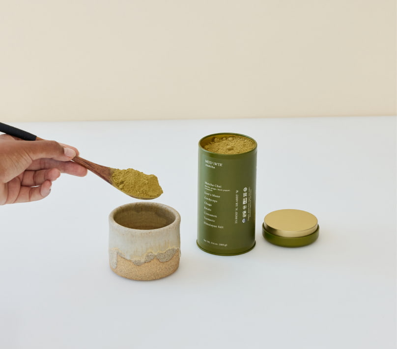 This matcha is 100% organic and blended with spices, mushrooms and mycelium. With a fraction of the caffeine of coffee, and naturally occurring L-theanine, you get energy, focus, and immune support, without the jitters, crash, and poor sleep.